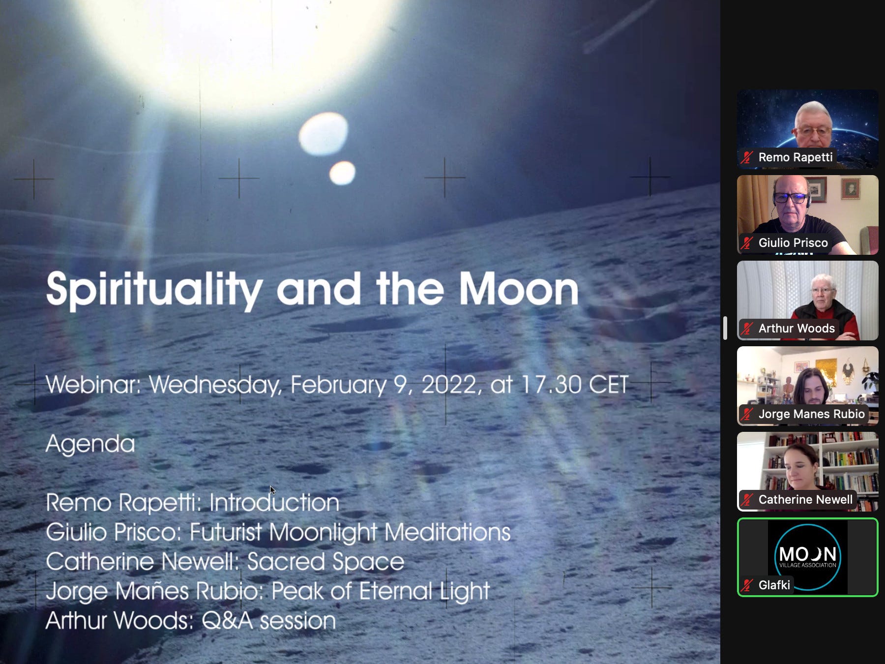 On February 9 I gave a talk at a webinar titled “Spirituality and the Moon,” organized by the Cultural Considerations Working Group of the Moon Village Association. The webinar was moderated by Remo Rapetti and Arthur Woods, leaders of the Working Group.